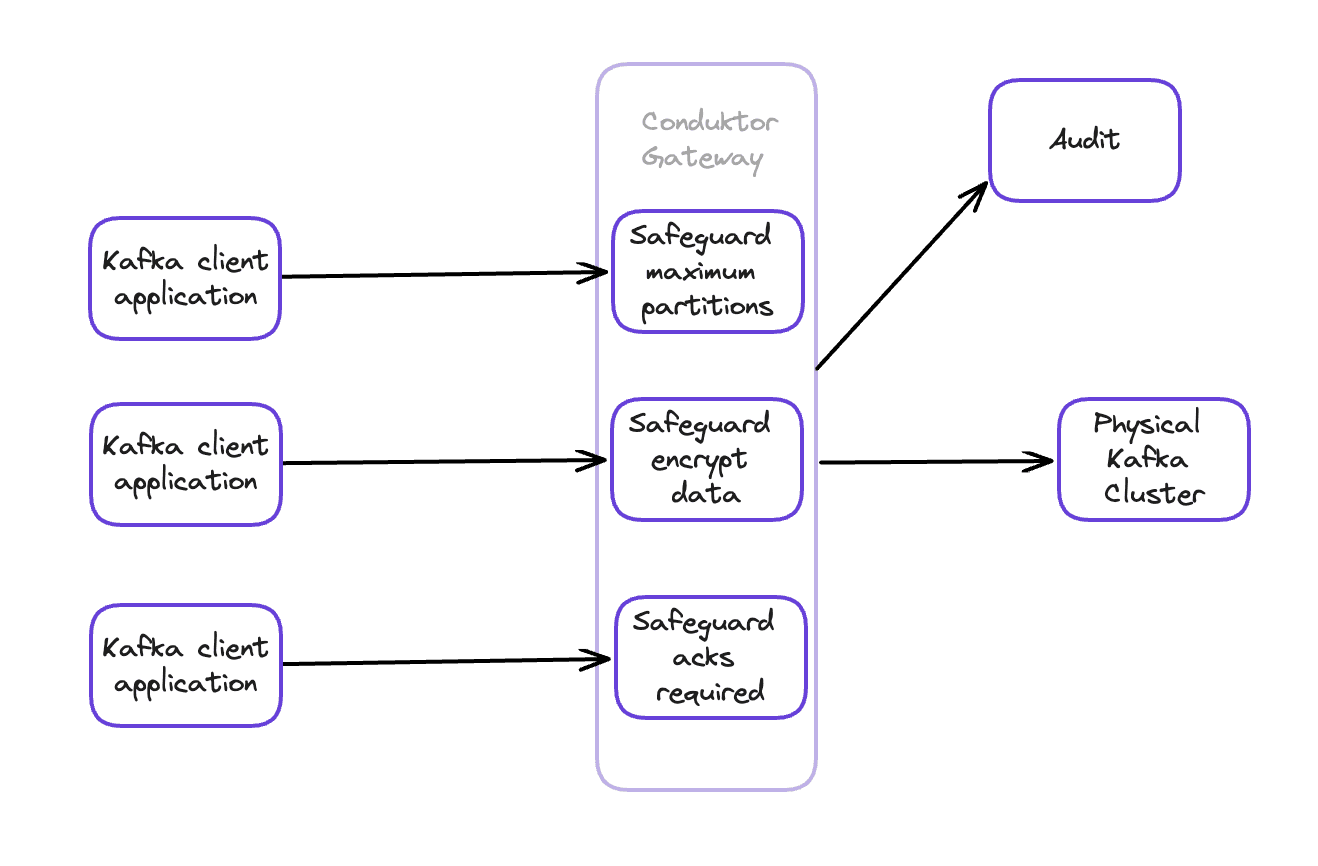 Every request passes through: topic creation, configuration changes, produce/consume operations, ACL setup. You get enforcement without touching applications or Kafka. Works across clusters, languages, and tooling.