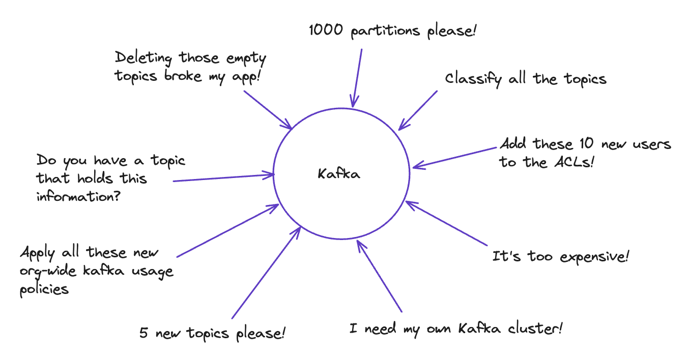A central Kafka team sounds reasonable. One group owns clusters, topics, ACLs, and configuration. Developers submit requests, the team executes.