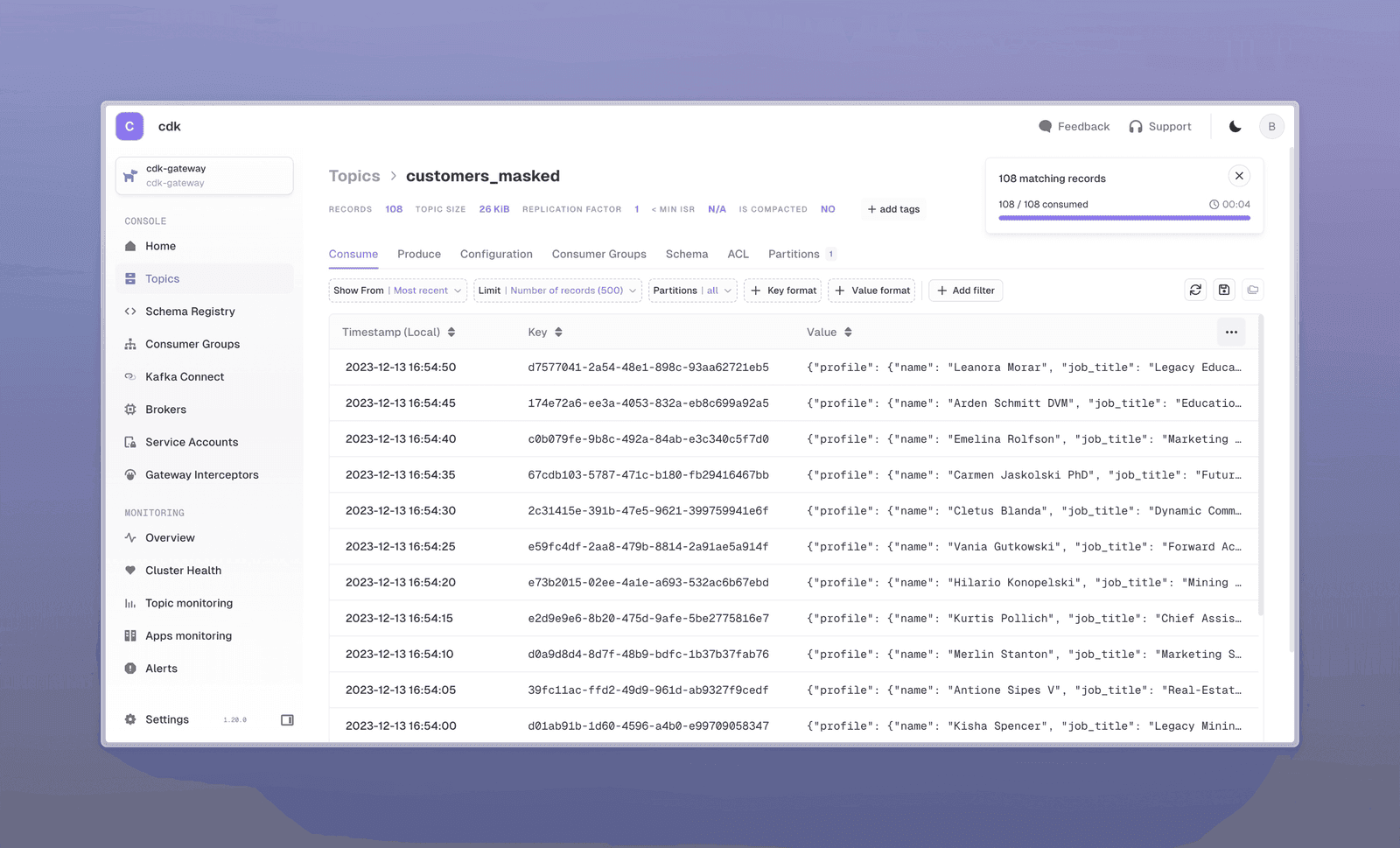 The embedded Kafka receives continuous sample ecommerce data: customers, products, purchases, and returns. The customers topic also has encrypted and masked versions.