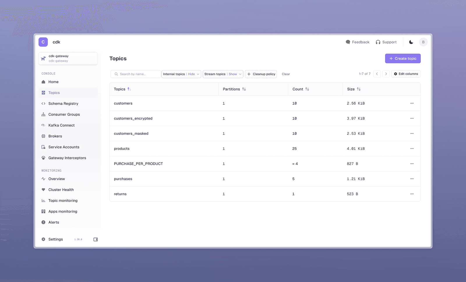 All topics are available on your get started cluster (named cdk-gateway):
