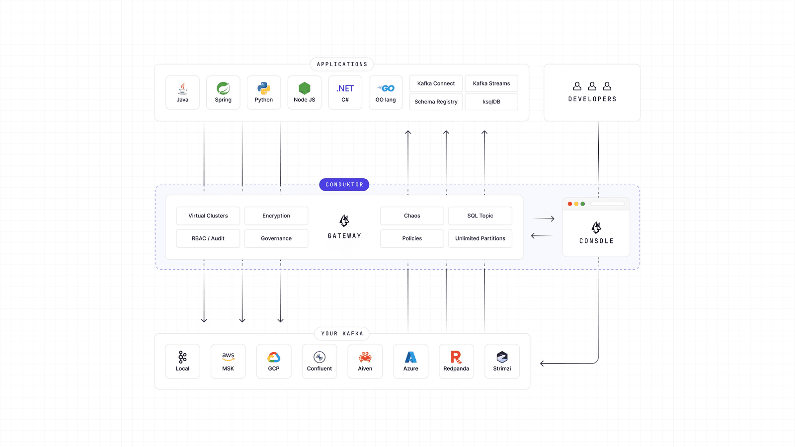 Conduktor works with all Kafka providers (Open-source, Confluent, AWS MSK, Aiven, Redpanda) via the standard Kafka Protocol.