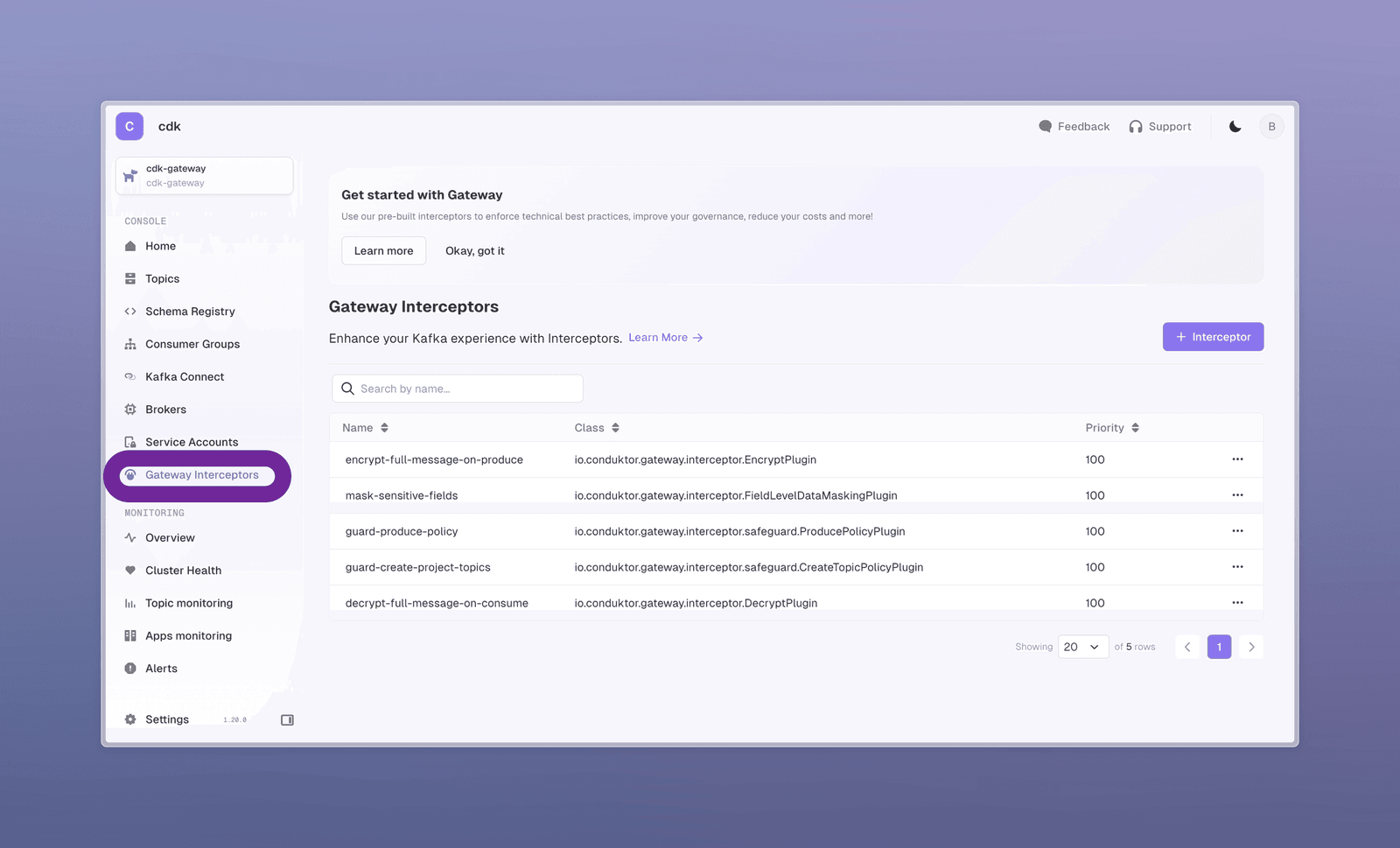 Conduktor interceptors power this. Navigate to Gateway Interceptors: