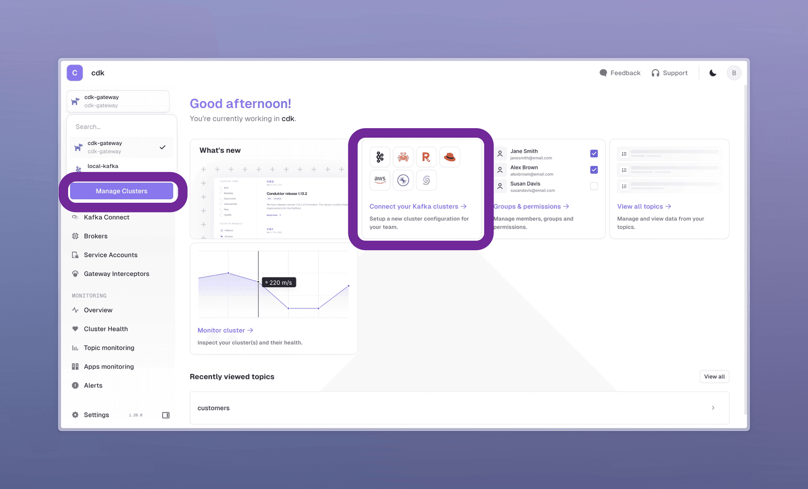The homescreen lets you connect clusters, manage groups and permissions with RBAC, or browse topics directly.