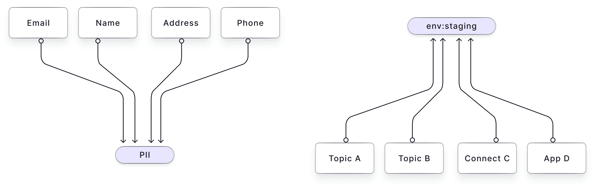 Data tagged as "PII" indicates personal identifiers like email, name, and phone number. In libraries, categorizing books under "A-B" doesn't pinpoint exact locations but enables binary-tree-style searching.