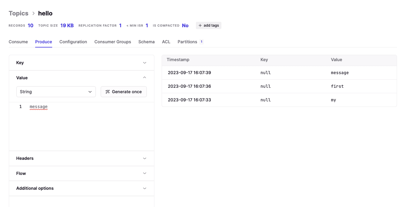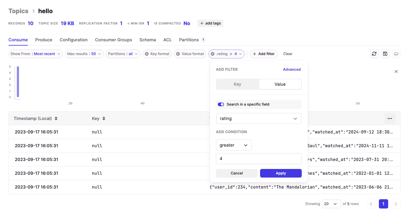 {"user_id":238,"content":"Better Call Saul","watched_at":"2023-07-11 19:00:00","rating":5} Send it to Kafka: