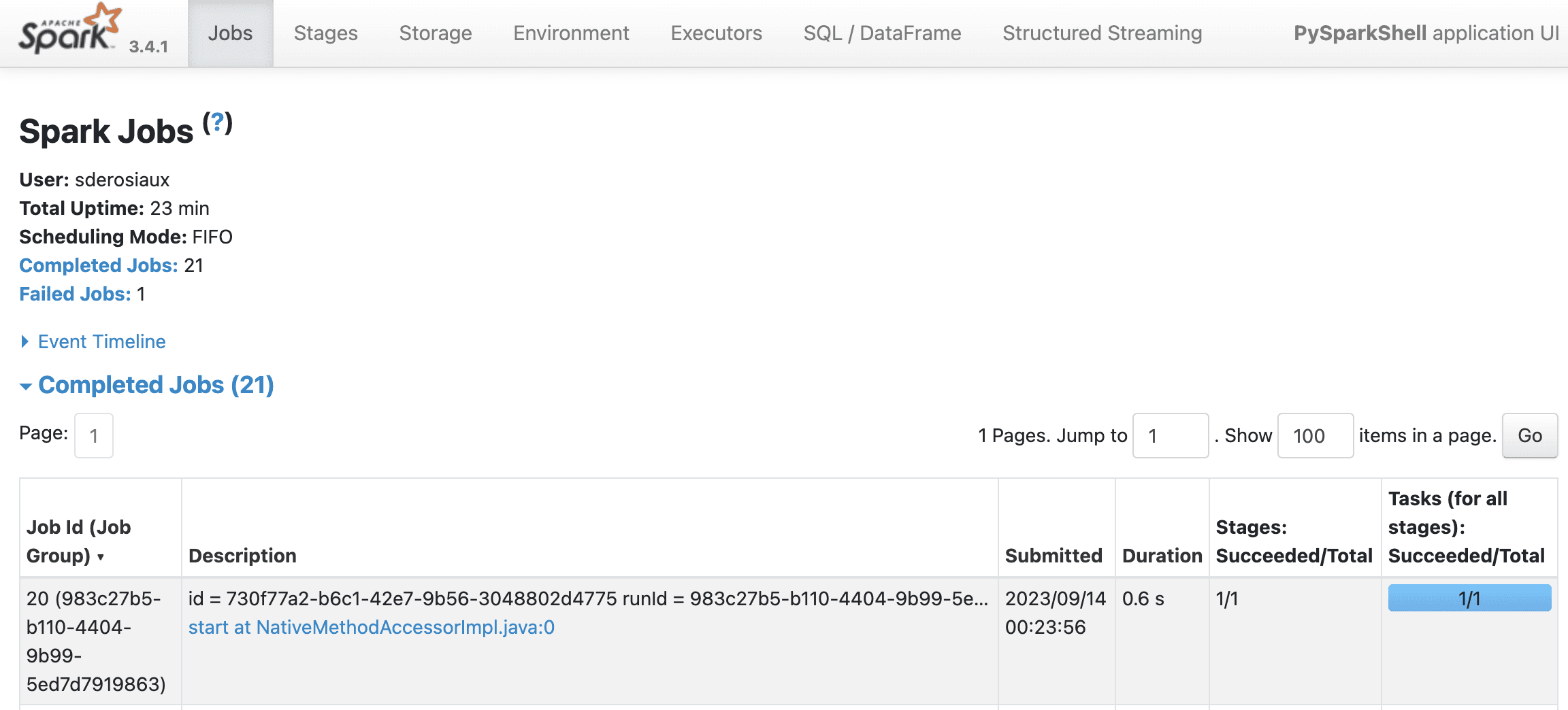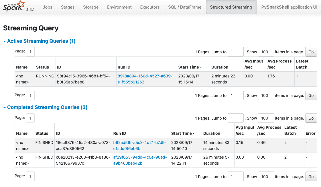 Shell work gets messy. You start streaming queries and forget to .stop() them. The Spark UI shows active queries and their status: