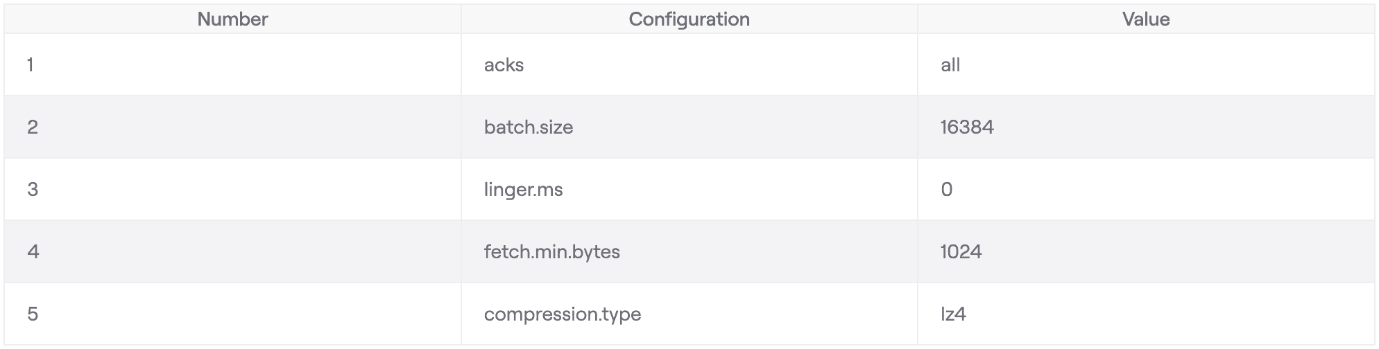 This shows a configuration with default Kafka client settings for batch.size and linger.ms, a custom setting for compression.type to enhance performance, and acks set to all for maximum reliability.