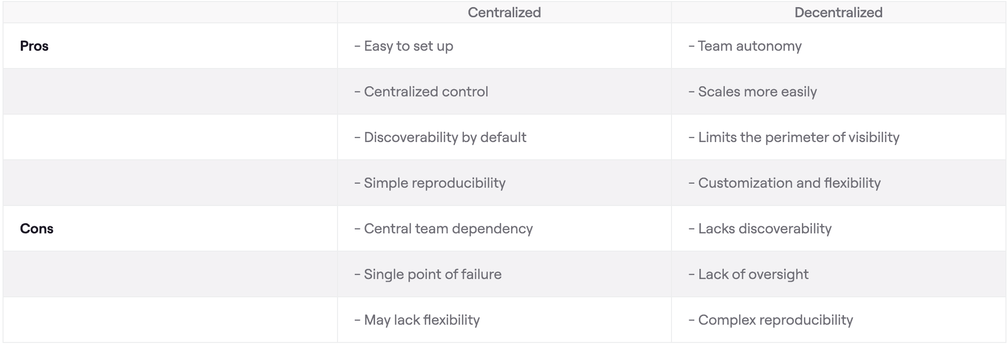 The right choice depends on your company structure and the trade-off between agility and governance requirements. Consider these pros and cons: