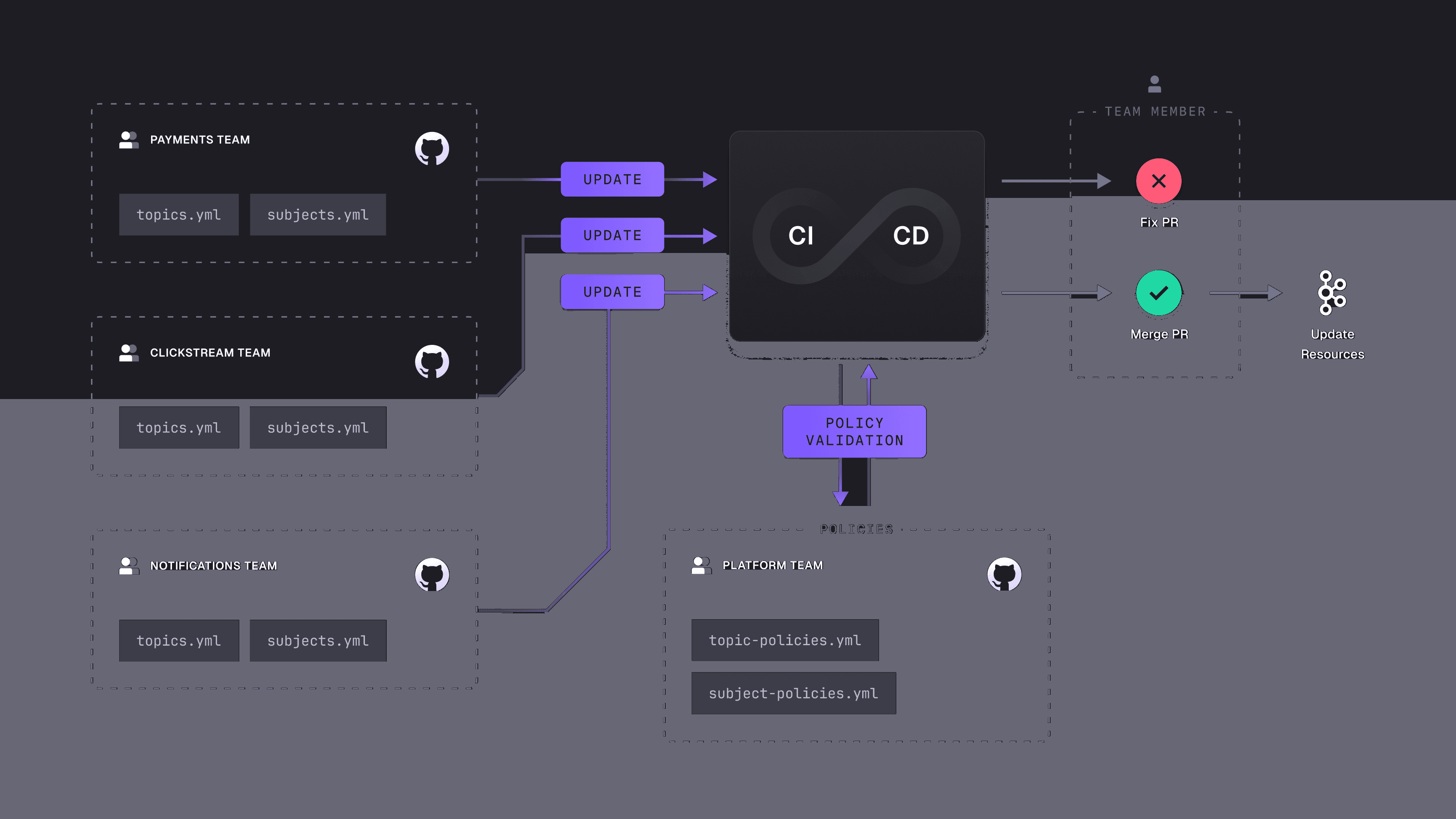 This results in a transparent approach with self-documenting artifacts and shared understanding of the Kafka infrastructure. It encourages communication and knowledge sharing between teams.