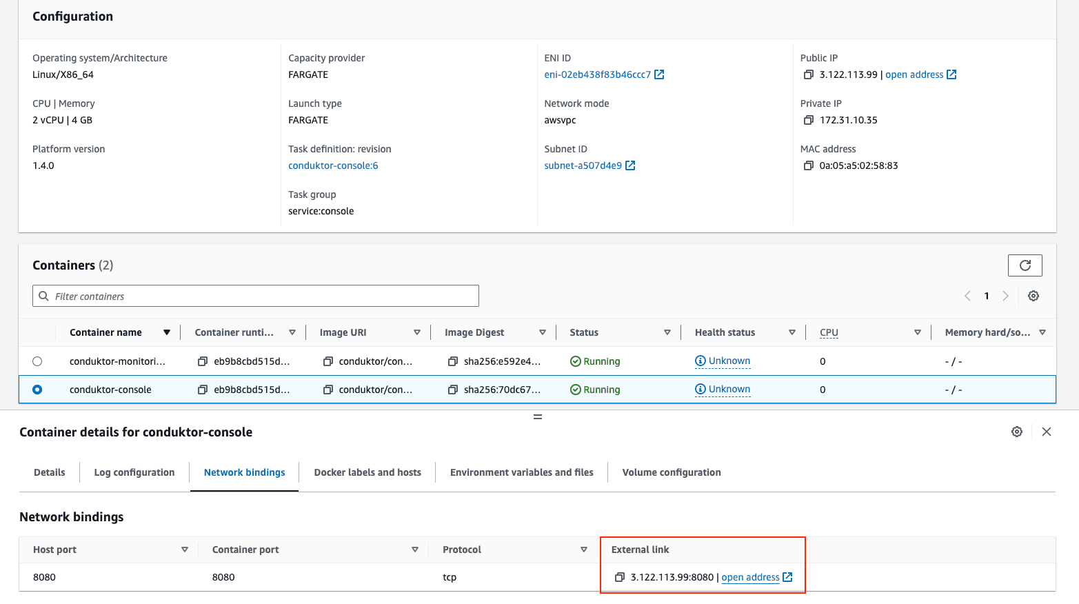 - Navigate to Cluster > Service > Task > Conduktor Console > Network Bindings and click the address