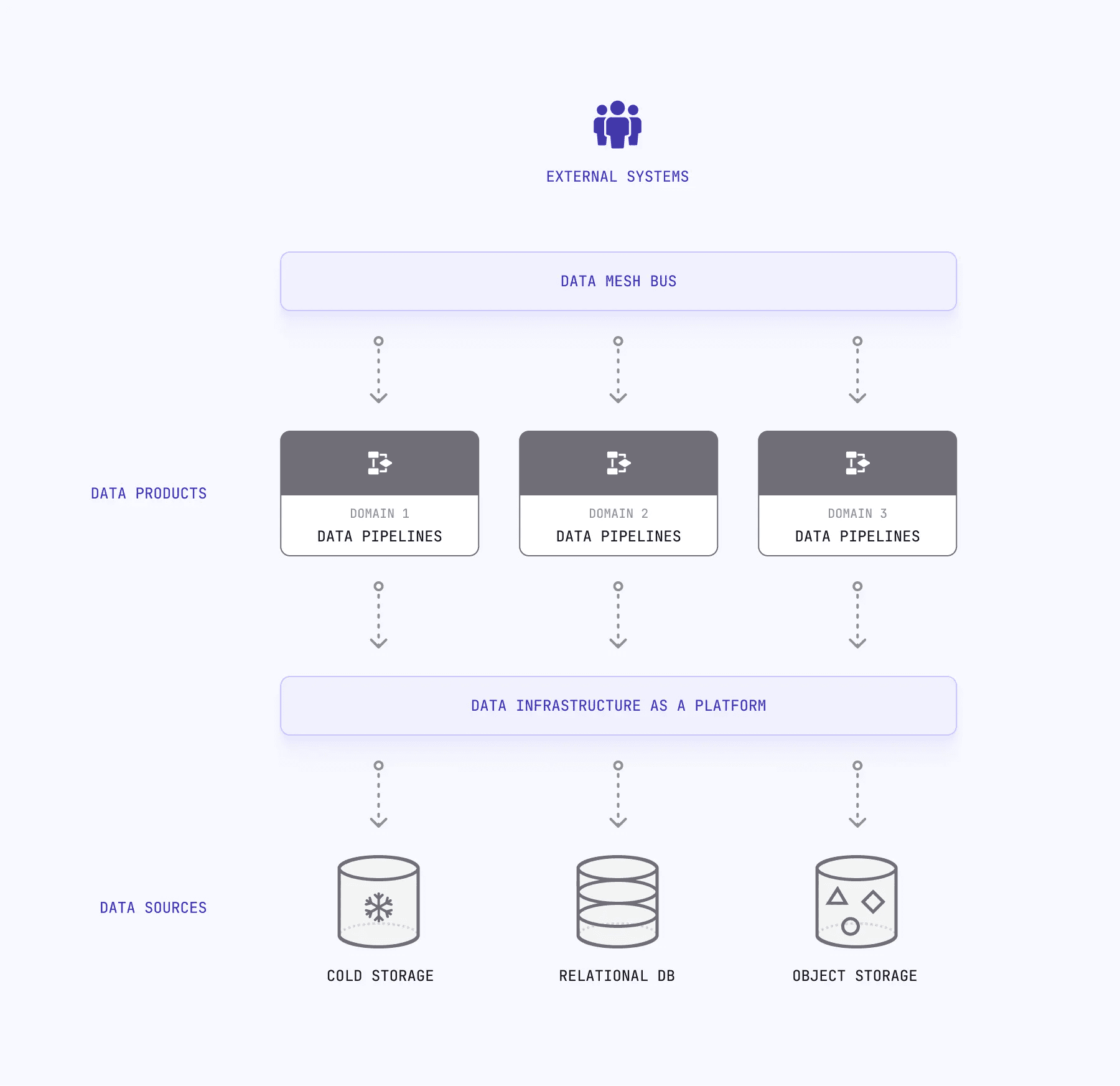 Domain-oriented decentralized data ownership. Data belongs to the domain experts who understand it best, not a central data team. This creates accountability and keeps data accurate, relevant, and current.