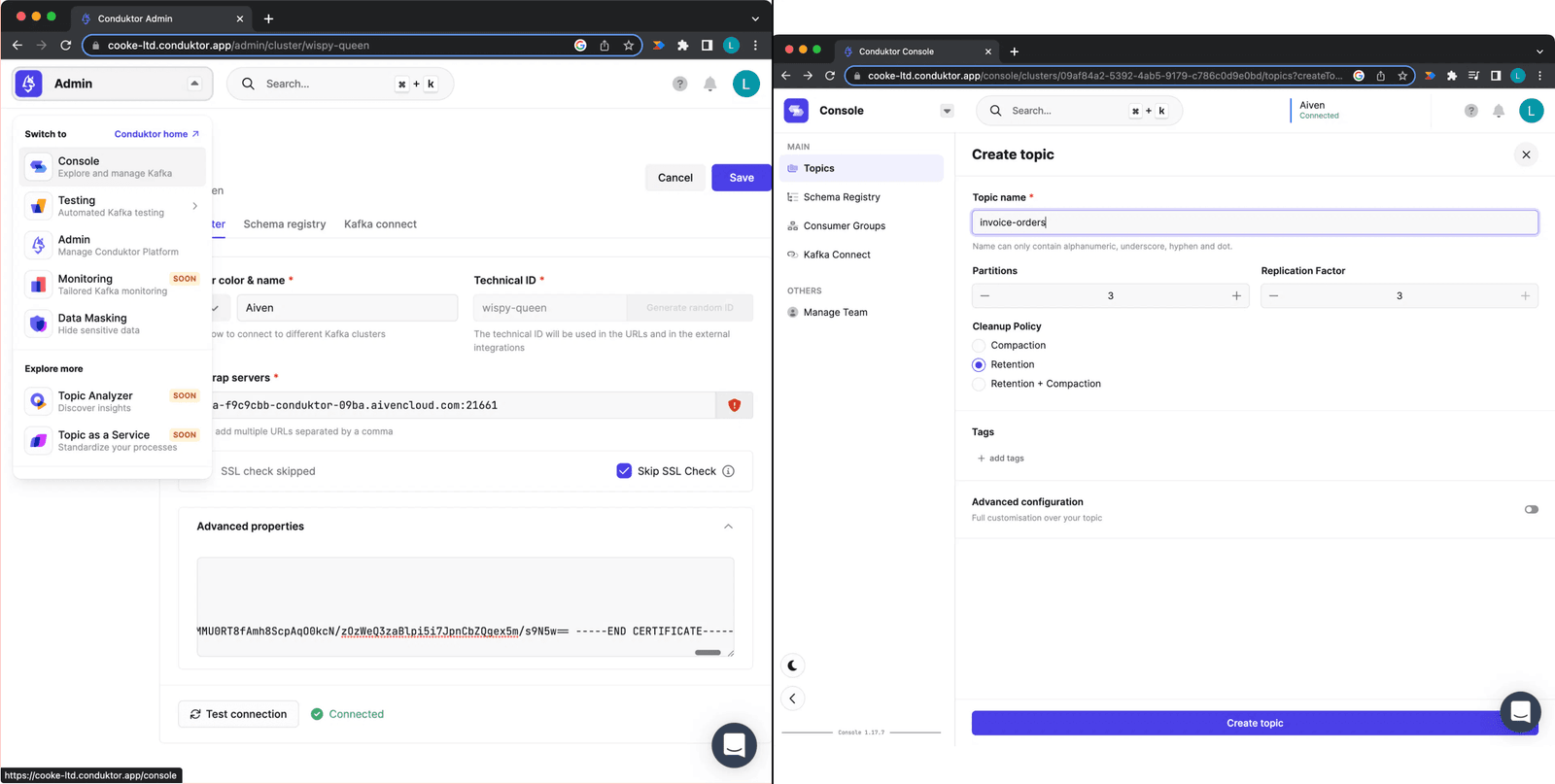 In Conduktor Platform Console, click "Create Topic" and create a topic called "invoice-orders."