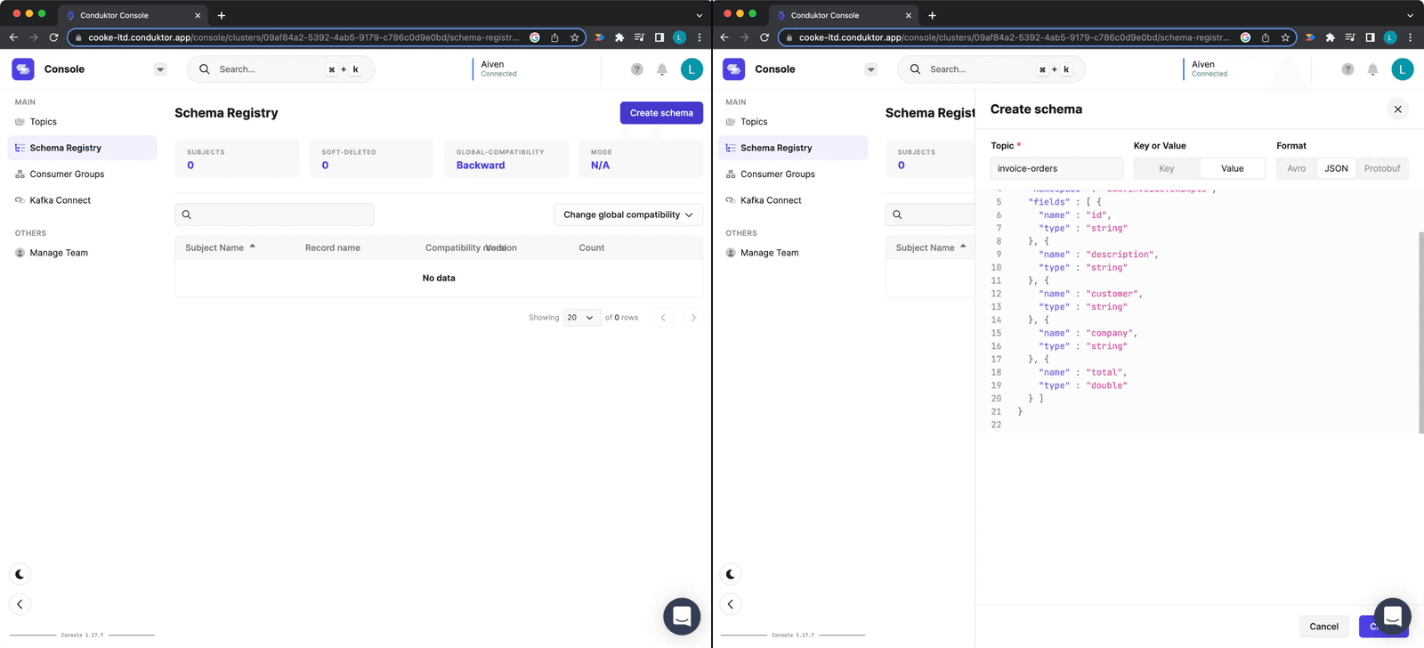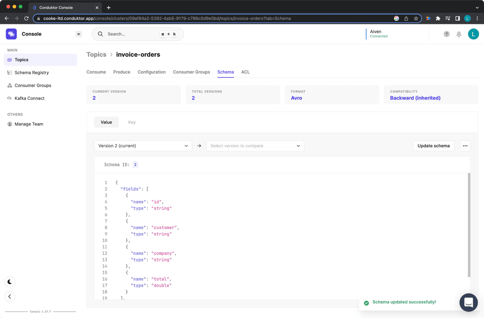 We will configure a Kafka cluster on Aiven with Karapace (their Schema Registry), then use Conduktor Platform to add a schema, update it, and verify compatibility.