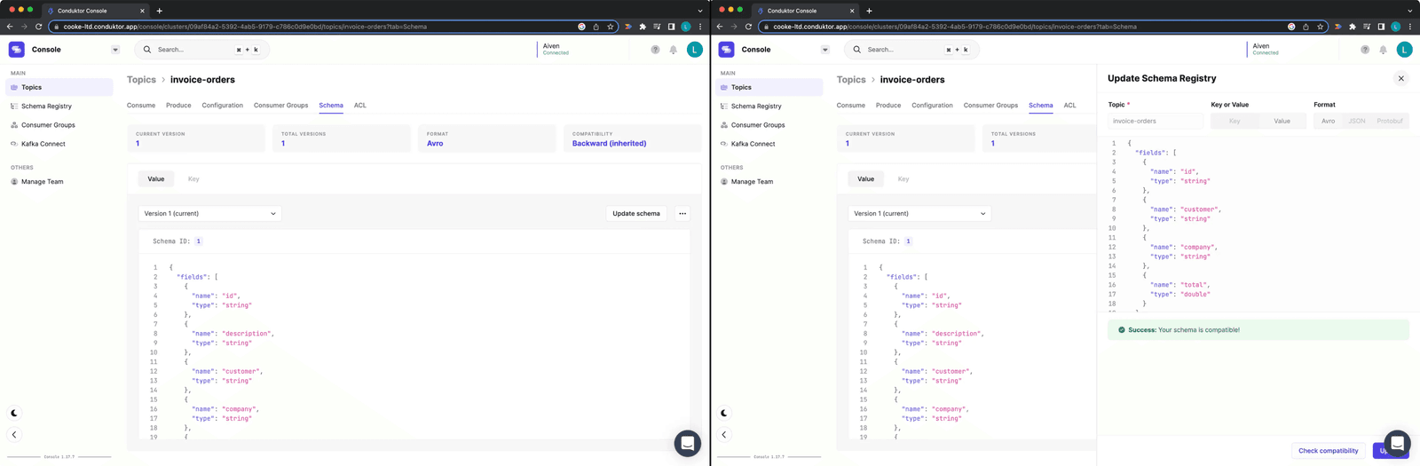 This standardizes Kafka data, ensures consistency, and enables safe evolution over time. Schemas have versions and can be updated. With Conduktor, you verify compatibility between old and new schemas before deployment.
