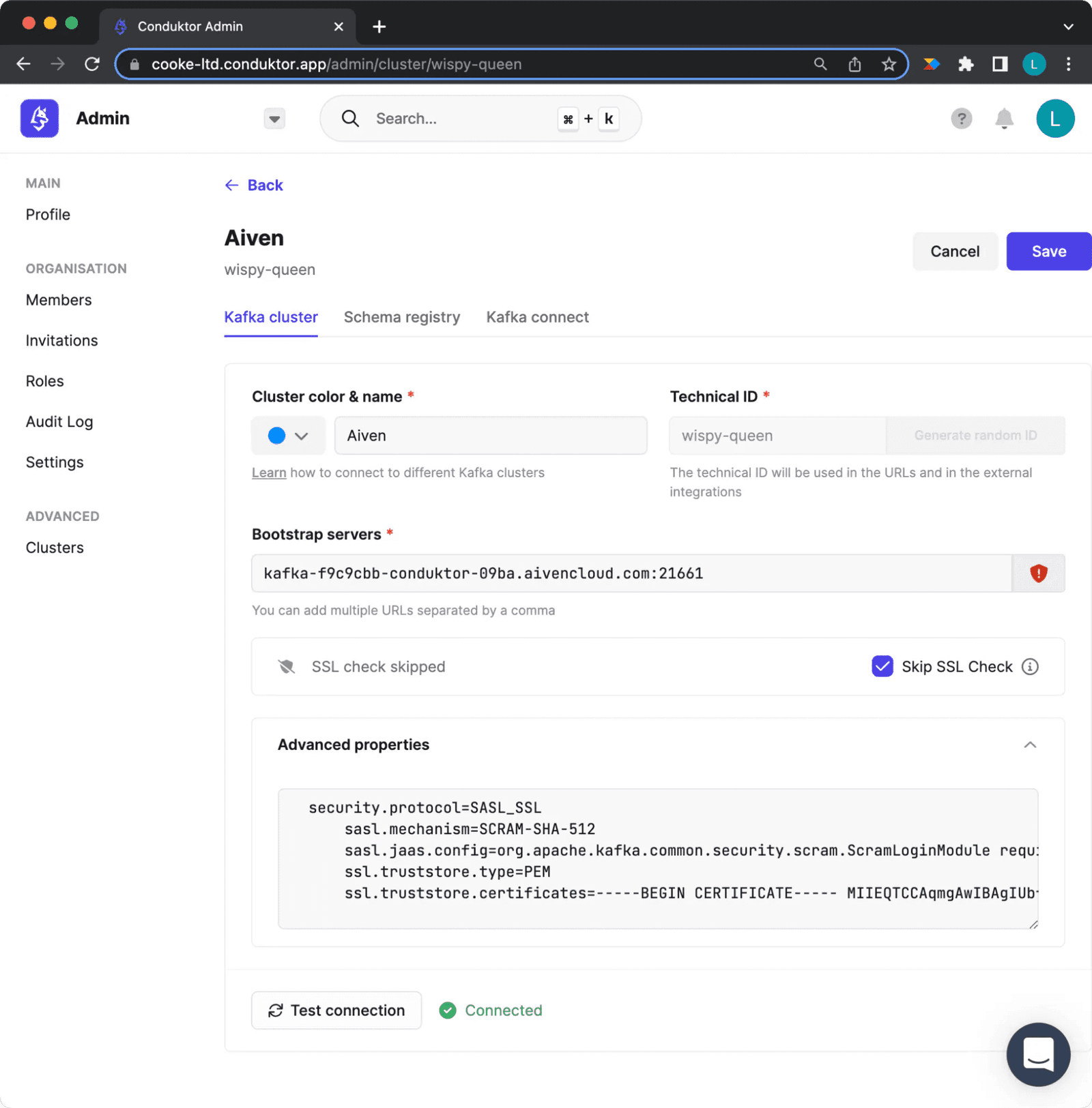 Enter the bootstrap server for your Aiven cluster. Add advanced settings in this format (certificate must be on one line):