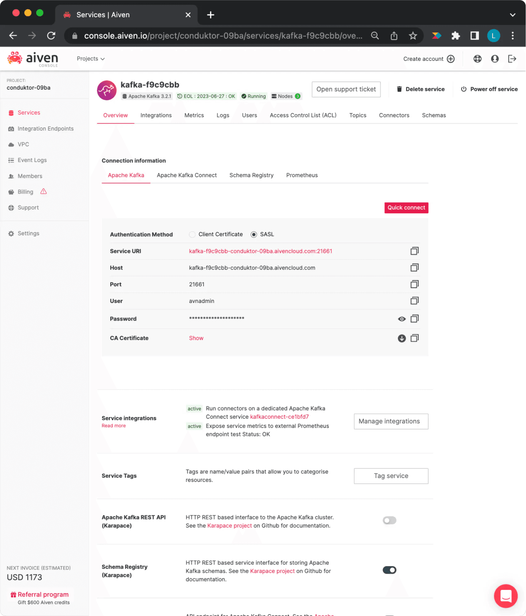 Get connection information from your Aiven Console (Figure 7), then enter it in the Clusters tab of the Admin section on Conduktor Platform (Figure 8).