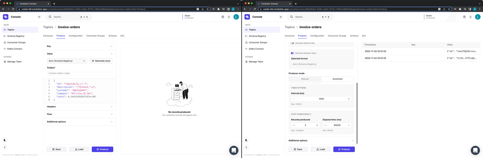 Conduktor Platform can produce messages that conform to your schema. Go to the "invoice-orders" topic. You can produce single messages or a continuous flow, ending after a count or time period.