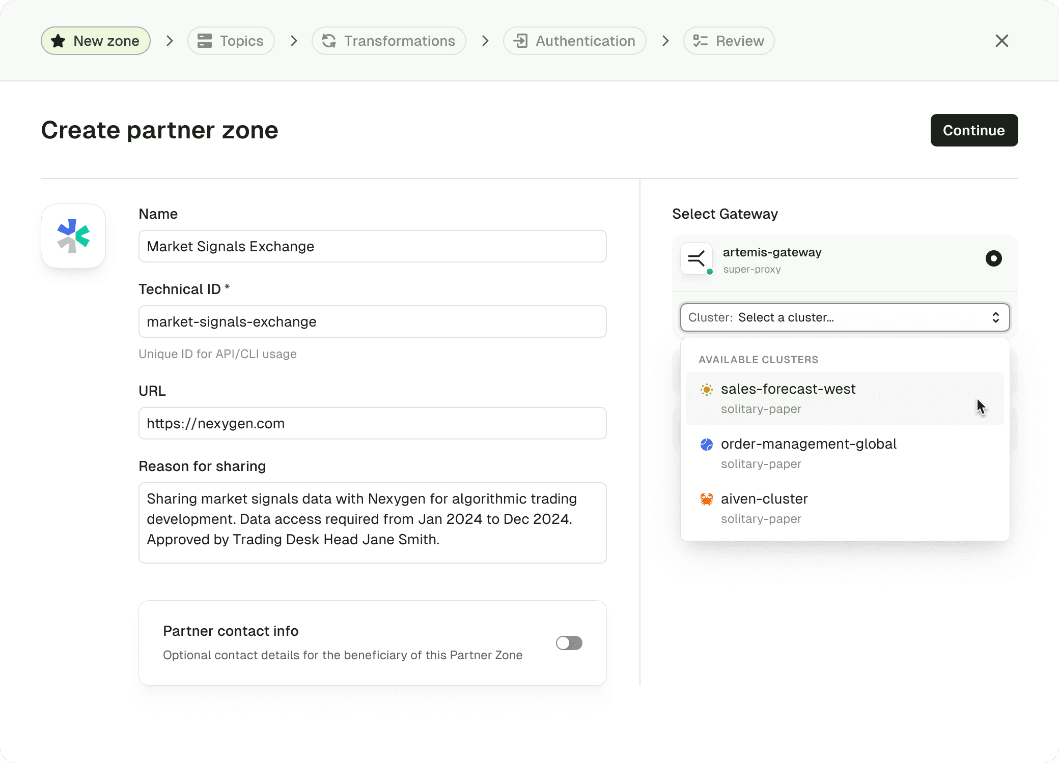 Partner Zones (now GA) work across any Kafka cluster configured in Gateway. Create isolated environments for external partners without spinning up multiple proxies.