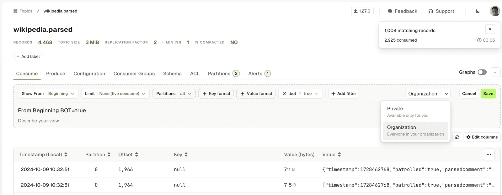 Filters in the Topic Consume view are shareable. Save filters as Private or Organization-wide to ensure everyone works with the same data subset.